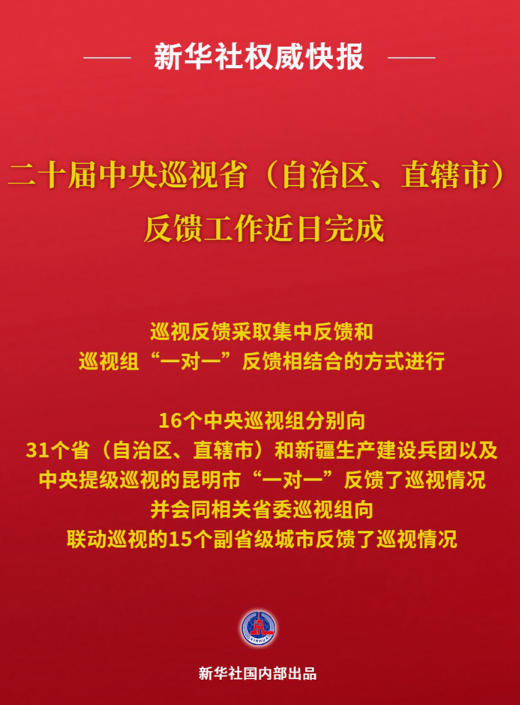 根据党中央部署,二十届中央巡视省(自治区、直辖市)反馈工作近日完成。巡视反馈采取集中反馈和巡视组“一对一”反馈相结合的方式进行。
