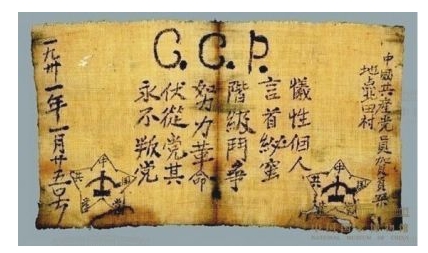这份入党宣誓书收藏在中国国家博物馆,也是现存最早的入党誓词文物。入党宣誓书的中间是入党誓词,从右向左分别是:“牺牲个人,言(严)首(守)纟必(秘)蜜(密),阶级斗争,努力革命,伏(服)从党其(纪),永不叛党”;正面上方写着中国共产党的英文缩写“CCP”;右侧的落款是中国共产党员贺页朵,地点北田村,左侧是时间,1931年1月25号。