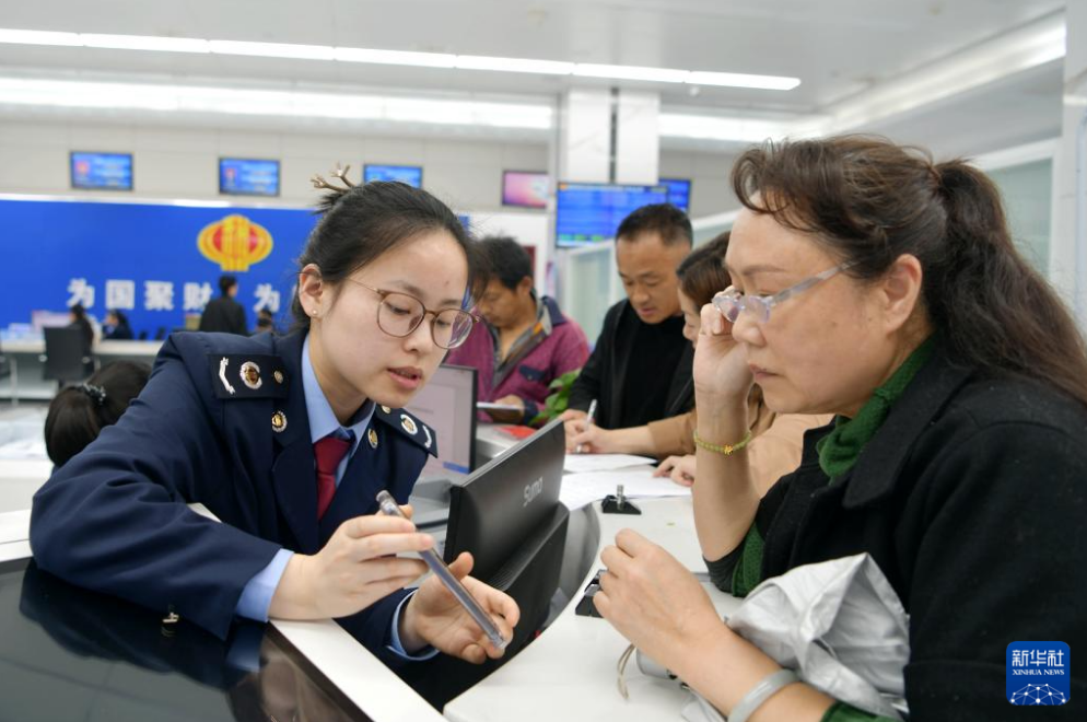 4月8日,在湖北省咸宁市通城县政务服务中心,工作人员指导市民手机办理纳税业务。新华社发(刘建平摄)