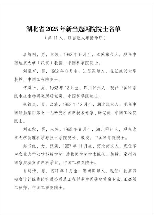 2025年金秋时节,湖北又一次迎来科技丰收季。在全国新产生的两院院士中,唐辉明、刘泉声、何舜平、张锦岚、刘正猷、赵书红、肖明清、姜卫平、尹周平、鲁军勇等湖北11位科学家成功当选为中国科学院院士和中国工程院院士,其中武汉大学、华中科技大学、中国地质大学(武汉)、华中农业大学的7人榜上有名,一名外籍院士诞生于华中科技大学。