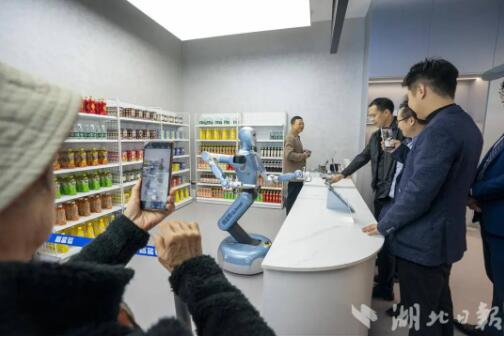 11月11日,全国首家人形机器人7S店在武汉开业,顾客正在体验机器人超市服务。(湖北日报全媒记者 魏铼 摄)