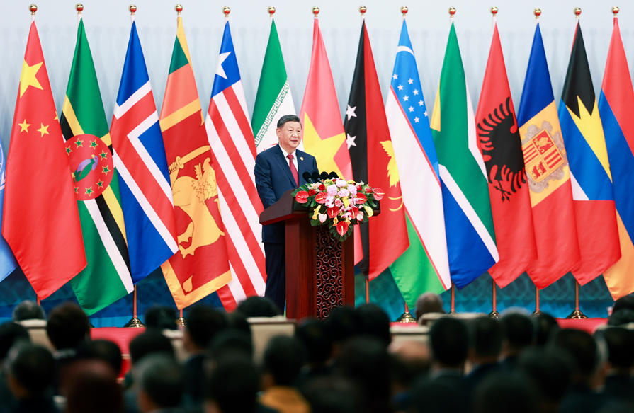 金秋时节,天朗气清。国家会议中心会场内,各国国旗和联合国旗帜组成恢弘旗阵。
