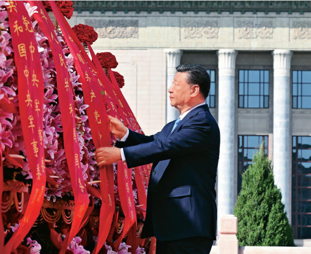 2025年9月30日上午,党和国家领导人习近平、李强、赵乐际、王沪宁、蔡奇、丁薛祥、李希、韩正等来到北京天安门广场,出席烈士纪念日向人民英雄敬献花篮仪式。这是习近平整理花篮上的缎带。 新华社记者 李响/摄